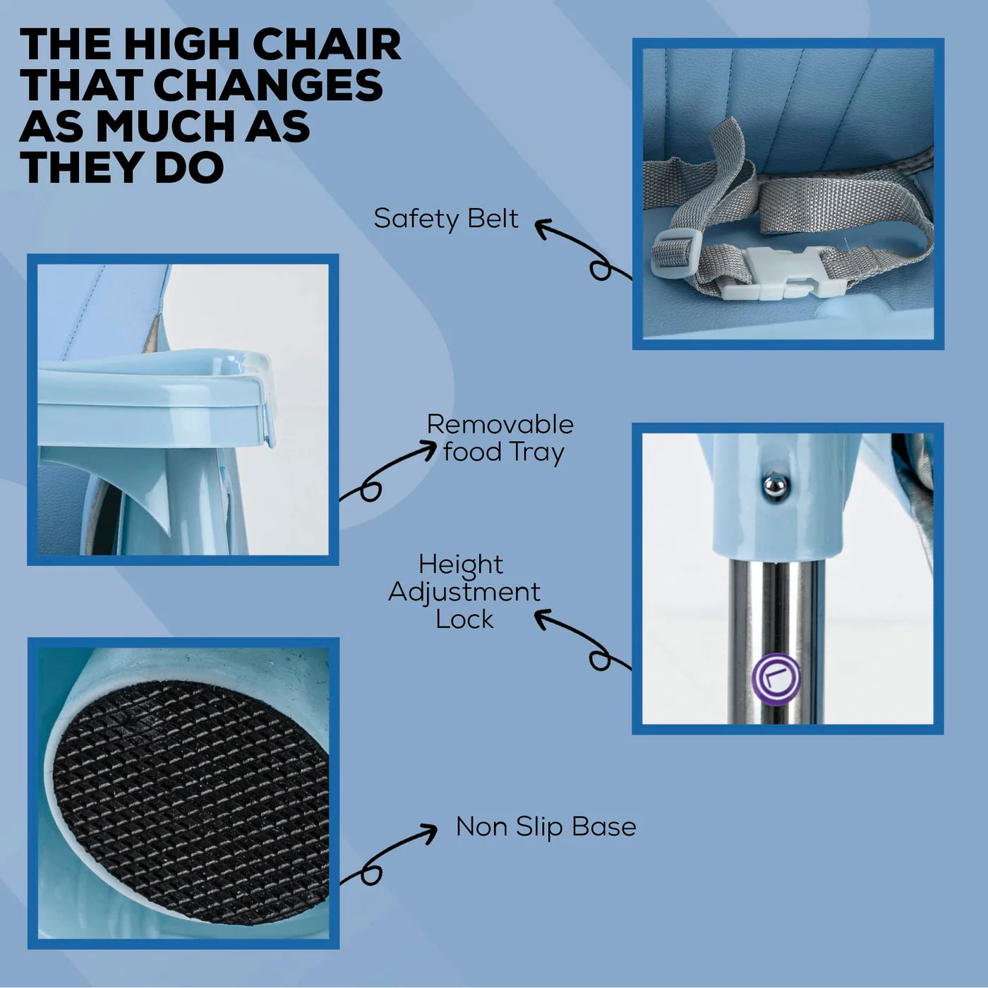 The chair features a 5-point safety harness to keep your baby secure, along with a detachable and adjustable feeding tray that makes mealtime convenient and mess-free. The reclining padded seat ensures comfort during feeding or resting, while its foldable design makes it compact and easy to store.