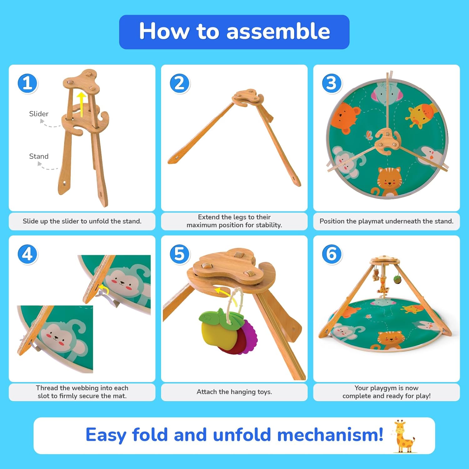 • Advantages & Imagination: The Wooden Wonderland Playgym fosters key developmental milestones, including head control, hand-eye coordination, and muscle strengthening. Tummy time is vital for helping babies enhance their muscle tone and coordination, while the bright colors and animal designs provide visual stimulation and cognitive growth.